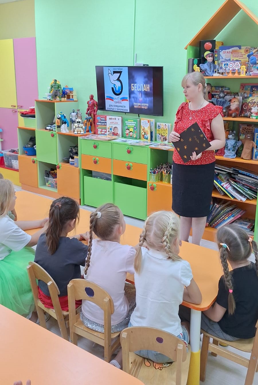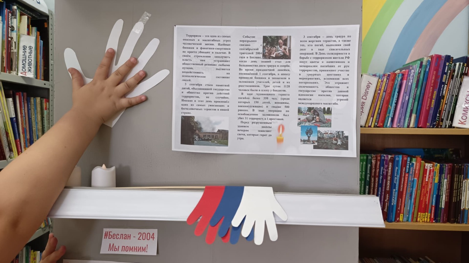 В ходе мероприятия библиотекарь рассказала детям о трагических событиях трех дней в городе Беслане, когда в результате террористического акта погибли более 300 человек, в основном дети и женщины. Присутствующие подробно узнали о последствиях, жертвах и жестокости терроризма.