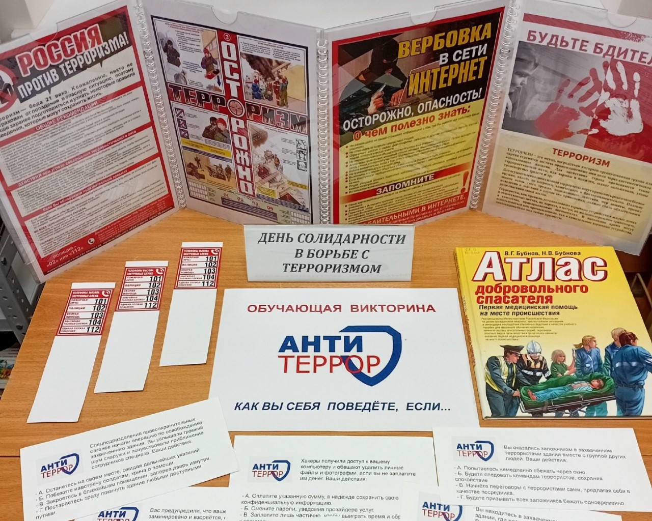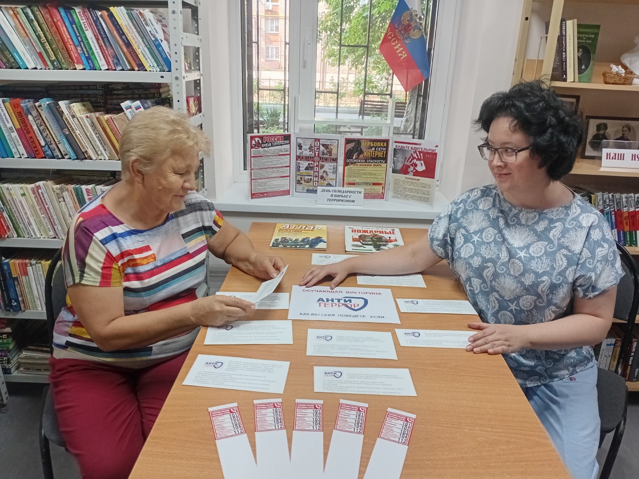 Читатели смогли освежить свои знания о правилах поведения в чрезвычайных ситуациях, участвуя в обучающей викторине «Антитеррор». Гости библиотеки тянули карточку, содержащую описание потенциально опасной ситуации и должны были выбрать из четырех предложенных правильный вариант своих действий.