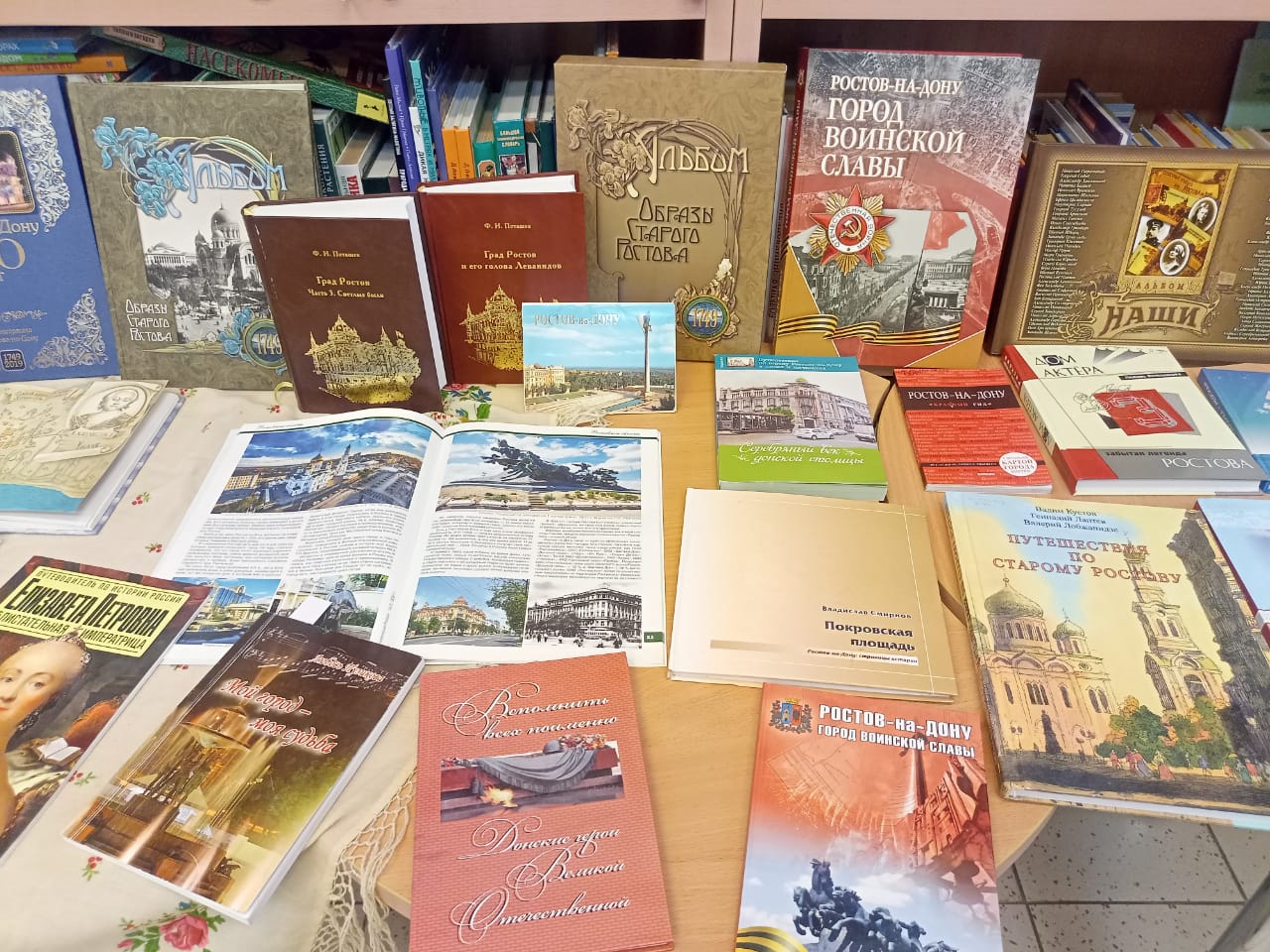 К краеведческому экскурсу была подготовлена книжная выставка «Путешествие по Ростову-на-Дону», на которой была представлена литература о прошлом и настоящем города, о знаменитых людях, родившихся и работавших в Ростове-на-Дону, а также краеведческие издания Л. Волошиновой, В. Смирнова, В. Беленького и др.