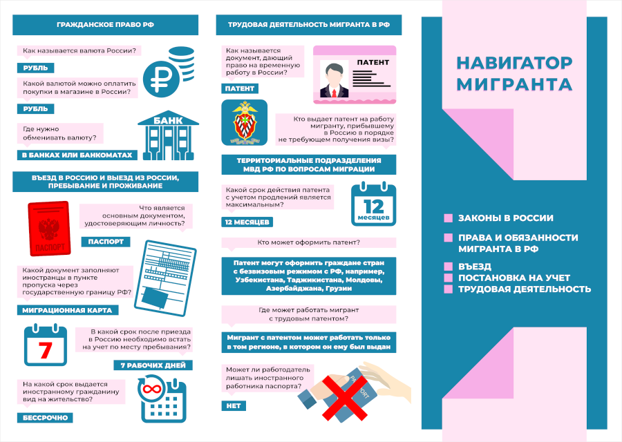 Предлагаем вашему вниманию буклеты под названием «Навигатор мигранта». Информационные материалы «Навигатор мигранта» играют ключевую роль в профилактике распространения идеологии терроризма, предоставляя мигрантам четкое понимание правил пребывания и адаптации в России.
