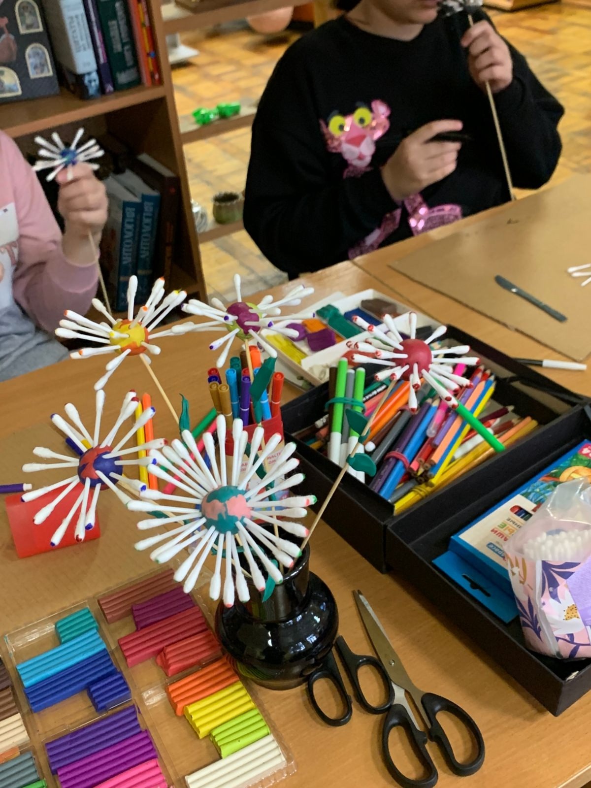 В ход пошли ватные палочки, деревянные шпажки, шарики из пластилина и фломастеры. из этих незамысловатых вещей получились цветы - дубки. «Дубки» — это народное название корейских мелкоцветковых хризантем. Эти растения, включают множество видов и сортов с разнообразными формами и размерами соцветий.