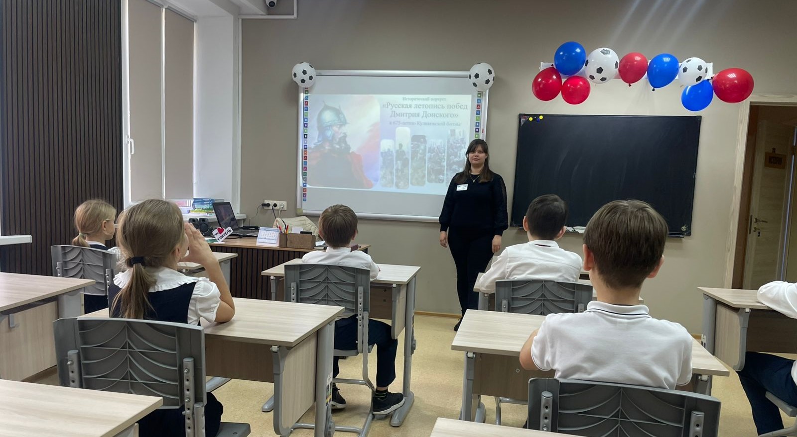 Учащимся рассказали о жизненном пути, становлении князя Дмитрия Донского, показали презентацию о нём и осветили наиболее интересные исторические факты о Куликовской битве.