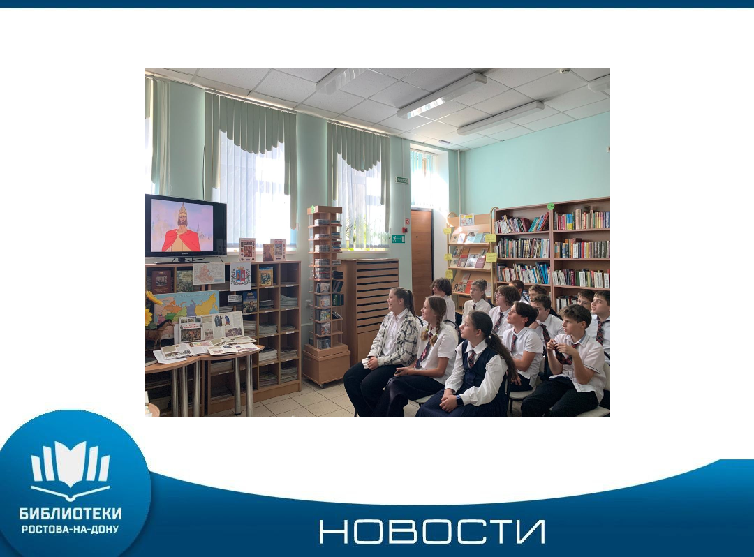 В преддверии Дня воинской славы России - 645-ой годовщины победы русских ратников во главе с Московским князем Дмитрием Ивановичем над войсками Орды в Куликовской битве в библиотеке имени В. В. Маяковского проведён патриотический час «Стяги Куликова поля» для учеников 6 «Б» класса ростовской школы №47. Гости узнали о «младых летах княжича Дмитрия», о темнике-ордынце Мамае, о принятии благословения на битву у преподобного Сергия Радонежского и иноках-воинах Ослябе и Пересвете. В беседе школьники обсудили ...