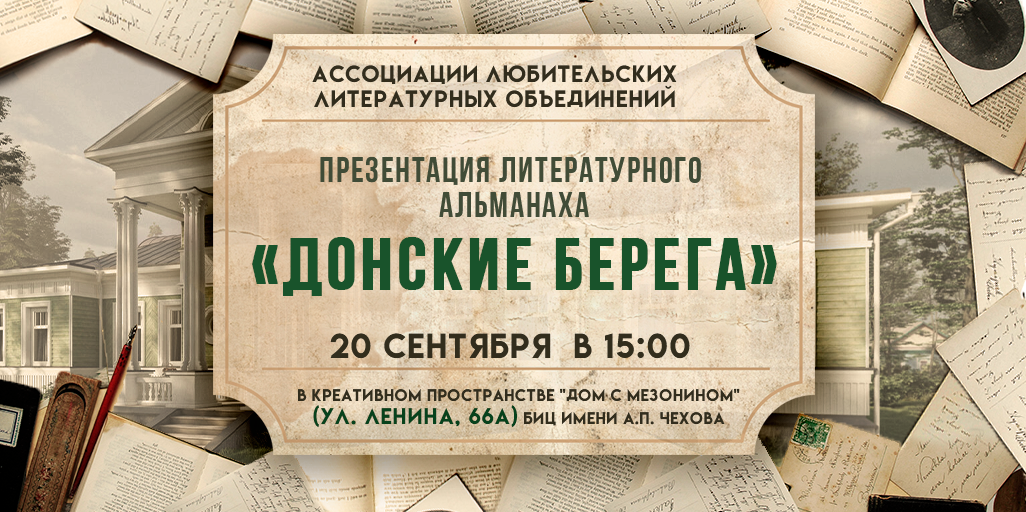 Уважаемые читатели! 20 сентября в 15:00 в Креативном пространстве «Дом с мезонином» Библиотечно-информационный центр имени А. П. Чехова (улица Ленина, 66А) состоится презентация альманаха «Донские берега» вып. 3. Альманах выходит при поддержке Централизованной библиотечной системы города Ростова-на-Дону, печатаются в нем ростовские и донские авторы, члены литературных клубов. Приглашаем всех желающих. Вход бесплатный. Следите за новостями на нашем сайте, подписывайтесь на нас в социальных сет ...