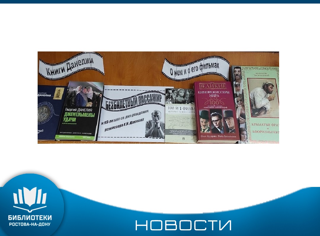 В библиотеке имени А.С. Пушкина прошел Час юбиляра «Георгий Данелия: в кино и в жизни», приуроченный к 95-летию режиссера Г. Н. Данелия. В начале встречи библиотекарь рассказала о жизни и творчестве Георгия Данелии, подчеркнув уникальное сочетание юмора и грусти в его фильмах. Были освещены главные темы творчества режиссера и роль его фильмов в культуре страны. Участникам была представлена книжная выставка «Безбилетный пассажир», включающая как книги самого Данелии, так и литературу о нём и его фильмах. ...