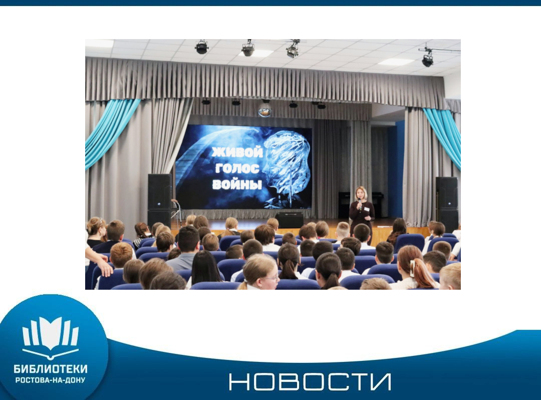 Детская библиотека К.И. Чуковского презентовала ростовским школьникам премьеру фильма «Живой голос войны», в рамках реализации программы по духовно-нравственному развитию и просвещению детей, подростков и молодежи города Ростова-на-Дону «СВЕТОЧ». Зрителями первой демонстрации стали учащиеся 5–7 классов. Перед началом показа к ребятам обратилась заведующая библиотекой имени К. И. Чуковского, руководитель проекта Дарья Павловна Давыдова. Она рассказала, что фильм «Живой голос войны» — это искренний ...