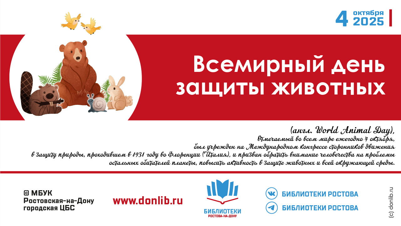 Каждый год Всемирный день защиты животных отмечается 4 октября. Его празднуют в России и еще нескольких десятках стран. В 2025 году по всему миру пройдут акции и благотворительные мероприятия, посвящённые этому дню. Праздник был учреждён на Международном конгрессе сторонников движения в защиту природы, проходившем в 1931 году во Флоренции (Италия), и призван обратить внимание человечества на проблемы остальных обитателей планеты, повысить активность в защите животных и всей окружающей среды. К этому ...