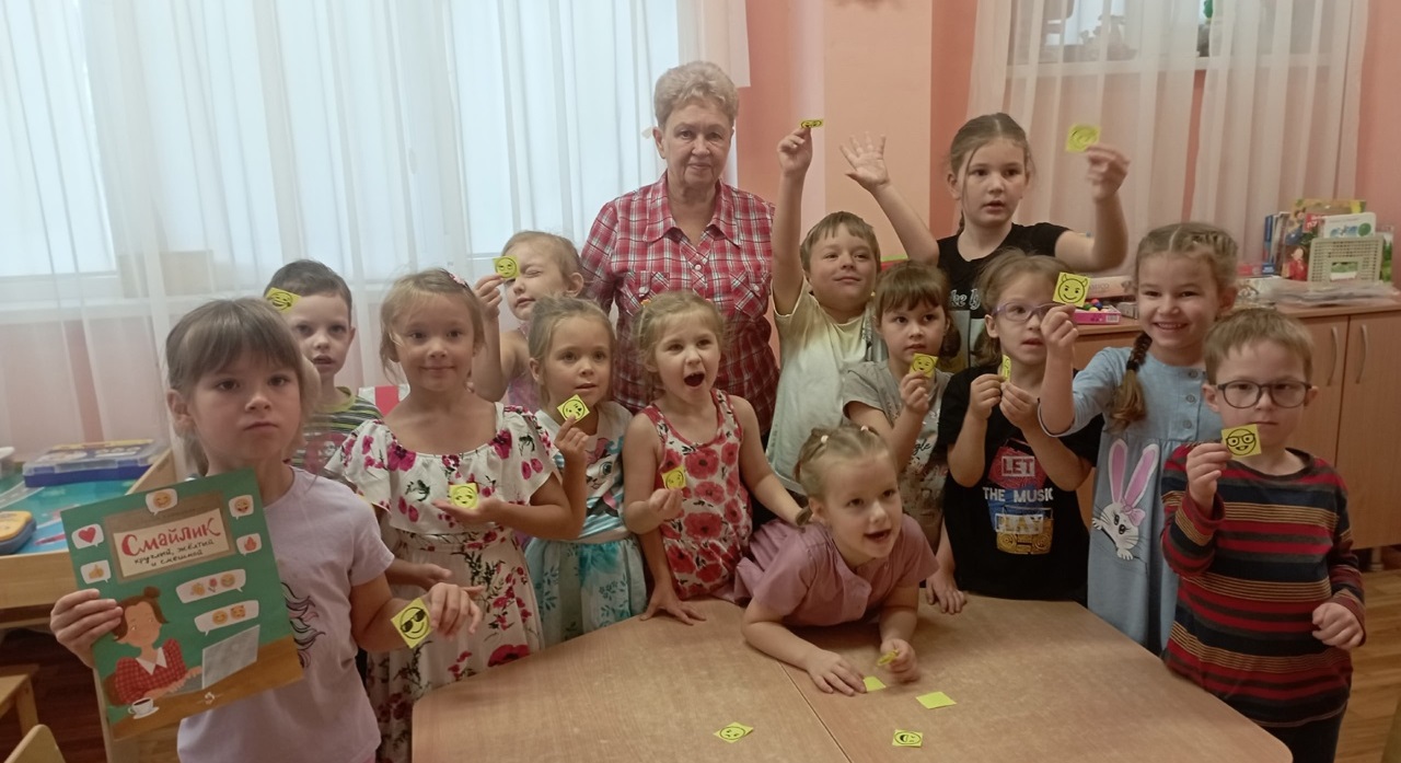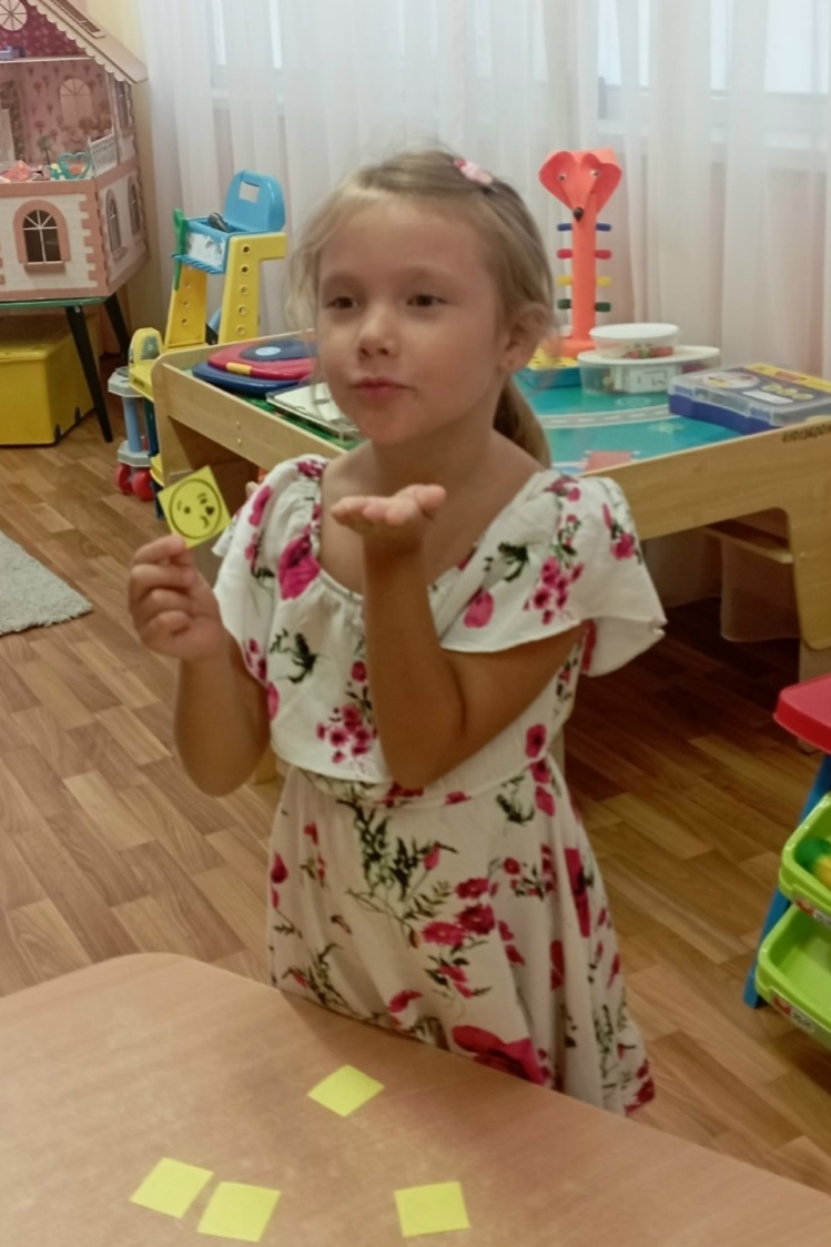 Затем дети учились показывать эмоции, вытягивая карточки с разными смайликами.