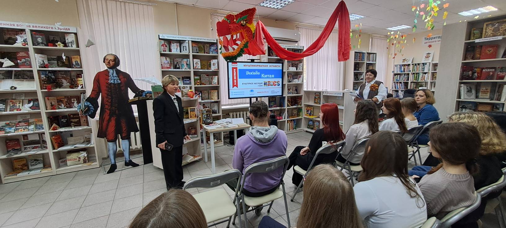 На открытии Декады Китая в Библиотечно-информационном центре имени М. В. Ломоносова приветствовала гостей специалист по работе с молодежью администрации Первомайского района Власюк Е.А. Она пожелала всем присутствующим интересных открытий и впечатлений от программы, подготовленной сотрудниками центра.