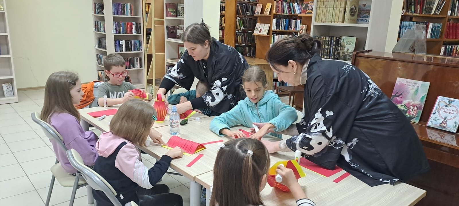 Продолжился это день встречей с юными читателями. Для них были приготовлены литературный час «Фольклор Китая: сказки, мифы и легенды», где дети вслух читали и обсуждали китайские сказки и легенды (громкие чтения) и мастер-класс по изготовлению китайских фонариков, который библиотекари проводили в китайских традиционных одеждах - кимано.