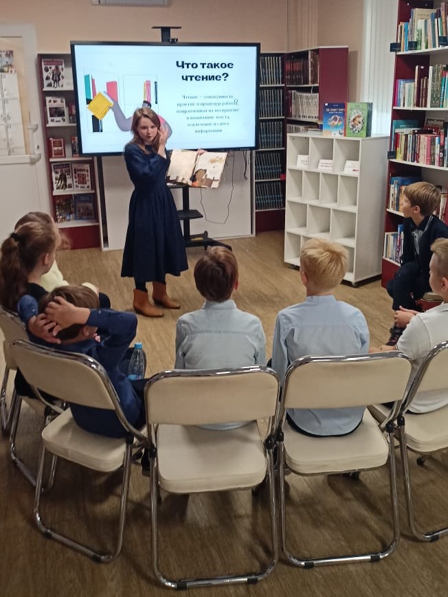 Далее дети вместе с библиотекарем обсудили, что такое чтение и в чём его польза, узнали о различных видах чтения и порассуждали о том, как их можно использовать в учёбе в школе.