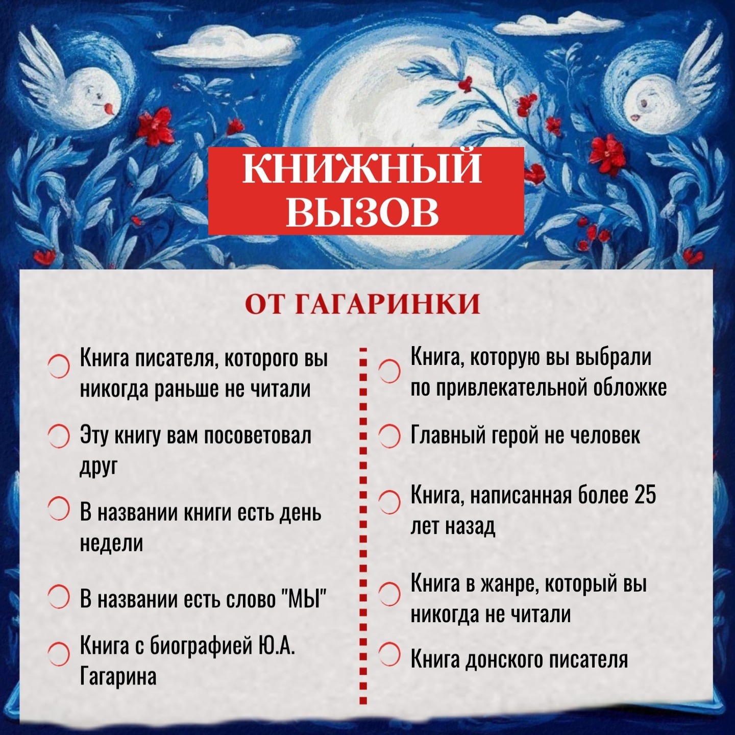 Опубликовать рецензию в своем аккаунте «ВКонтакте» с хештегом #КнижныйВызовГагаринкиРнД2025 (если у вас нет аккаунта, рецензию можно прислать в библиотеку (электронная почта: f1@donlib.ru) для публикации от вашего имени.