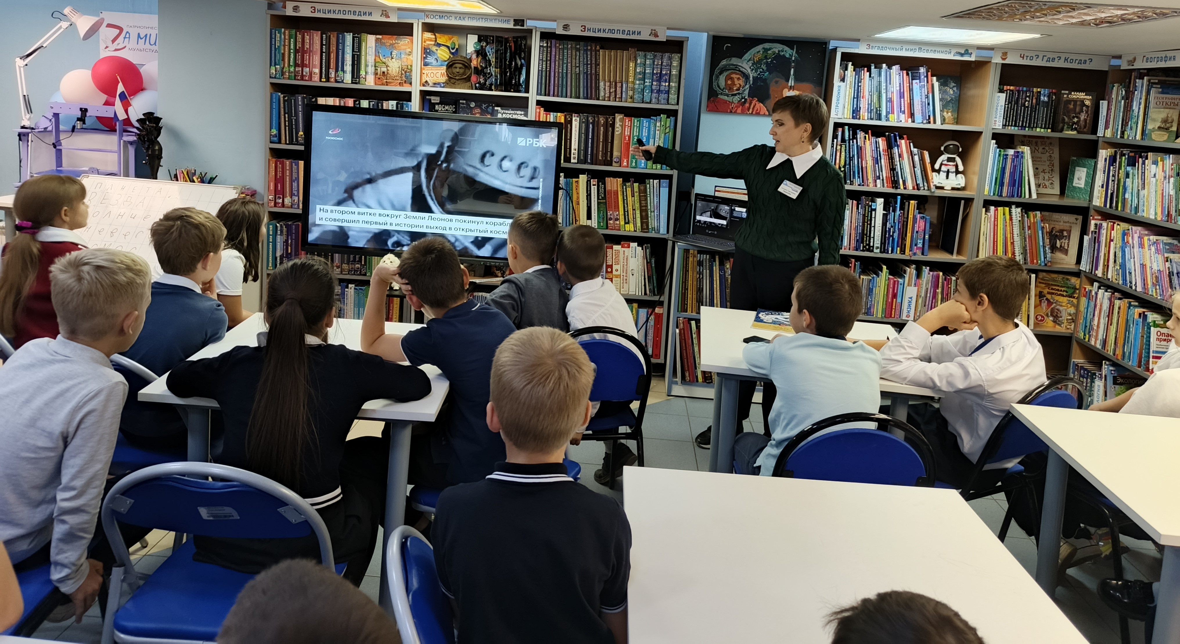 Для более яркого понимания героической миссии космонавта участники просмотрели видеоролик от Роскосмос ТВ «Космонавт Алексей Леонов». Этот фрагмент вызвал неподдельный интерес у школьников и помог им представить масштаб и сложности космических полетов.