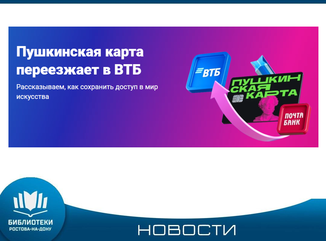 Уважаемые читатели, что с 1 января 2026 года роль оператора Программы перейдет от АО «Почта Банк» к Банку ВТБ (ПАО). Владельцам «Пушкинских карт» необходимо подать заявление на перевыпуск карты до 28 декабря 2025 года (включительно). Далее заявление на выпуск карты будет возможно подать с 1 января 2026 года. Выдача карт на физическом носителе начнется 12 января 2026 года. Ранее выпущенная карта АО «Почта Банк» будет работать без изменений до 31 декабря 2025 года. Подробная информация о сроках и порядке ...